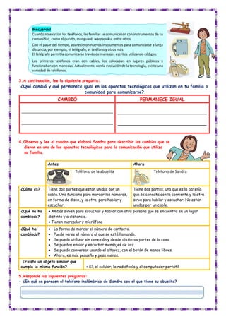 Este documento describe los cambios en los aparatos tecnológicos para la comunicación a través del tiempo en una familia peruana. Explica cómo antes se usaban instrumentos como el pututo, pero ahora se usan teléfonos celulares. Compara un teléfono fijo antiguo con el celular moderno de una niña, notando que el celular no tiene cables, se puede usar en cualquier parte de la casa, y permite enviar mensajes y hablar con altavoz. Finalmente, promueve un diálogo familiar sobre los cambios en los aparatos de comunicación a trav