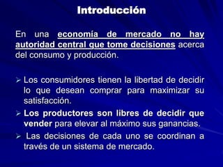 El documento explora la demanda y oferta en una economía de mercado, destacando cómo los consumidores eligen bienes para maximizar su satisfacción, mientras que los productores buscan maximizar ganancias. Se discuten conceptos como la ley de demanda y oferta, cambios en la cantidad demandada y ofrecida, así como el equilibrio de mercado y su determinación a través de la intersección de las curvas de oferta y demanda. También se menciona el impacto de factores externos, como precios de otros bienes y ingresos, en la demanda y oferta de productos específicos.