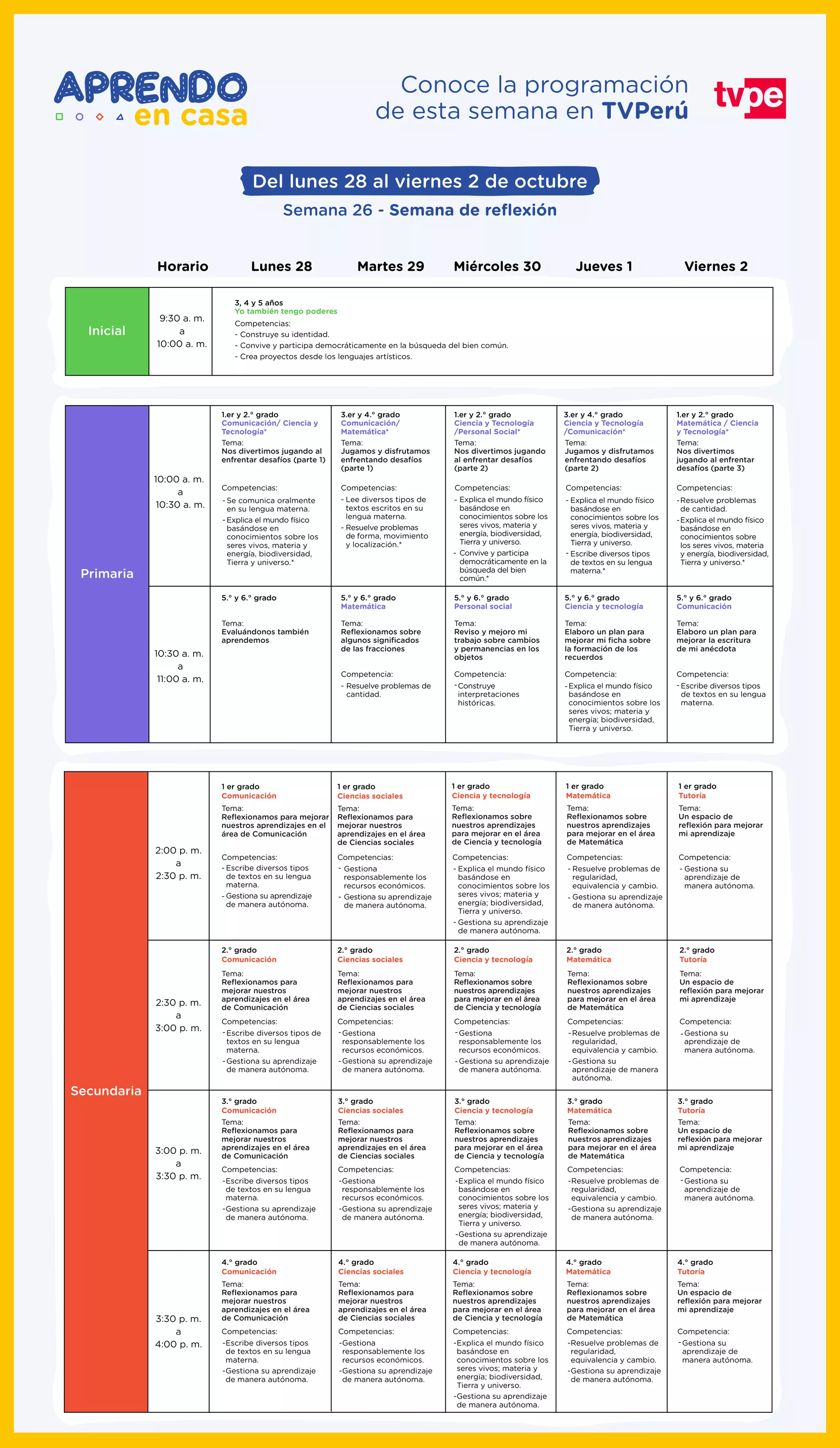 La programación de TVPerú para la semana del 28 de septiembre al 2 de octubre se centra en la reflexión sobre diferentes áreas educativas, incluyendo ciencia y tecnología, matemáticas, comunicación, y personal social, para diversos grados escolares. Se abordan temas como el aprendizaje autónomo, la resolución de problemas, y la participación democrática, destacando la importancia de los conocimientos sobre el mundo físico y la identidad personal. Además, se ofrecen espacios de tutoría para mejorar el aprendizaje en cada área.