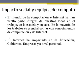 Internet y la computación se han vuelto parte integral de la vida moderna en el trabajo, la escuela y el hogar. Internet ha impactado la educación, el gobierno, las empresas y a los individuos. Se usa para el aprendizaje electrónico, el comercio electrónico, herramientas para discapacitados y servicios gubernamentales en línea como el pago de impuestos. También ha dado lugar a nuevas herramientas de colaboración como blogs, wikis y redes sociales.