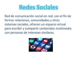 El documento describe varias redes sociales y herramientas digitales, incluyendo sus características y funciones principales. Entre las redes sociales descritas se encuentran Facebook, que permite compartir estados y actualizaciones con amigos; MySpace, que se enfoca en música y entretenimiento; y Wikipedia, la enciclopedia libre en línea. También se mencionan herramientas como Google Docs para editar documentos en la nube de manera colaborativa, YouTube para ver y compartir videos, y sitios como Amazon y Yahoo para comprar productos y acceder