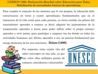 El documento discute los pilares y principios fundamentales de una educación de calidad según la UNESCO. Identifica cuatro aprendizajes fundamentales (aprender a conocer, hacer, vivir juntos y ser) y cinco principios de calidad (equidad, relevancia, pertinencia, eficacia y eficiencia). Concluye que una educación de calidad requiere considerar estas dimensiones e involucrar a todos los actores educativos en una mejora continua.
