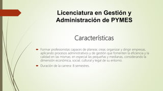 La licenciatura en Gestión y Administración de PYMES forma profesionales capaces de planear, crear, organizar y dirigir pequeñas y medianas empresas aplicando procesos administrativos y de gestión. El programa dura 8 semestres y prepara a los egresados para administrar recursos, tomar decisiones financieras, diseñar planes de mercadeo y realizar diagnósticos administrativos. La carrera es importante porque las pymes son clave para el desarrollo económico y social, y los estudiantes aprenden a gestionarlas en un ent