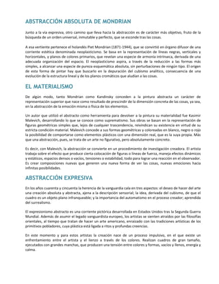 En el documento se describen las principales tendencias abstractas en el arte del siglo XX, incluyendo la abstracción espiritual de Kandinsky, la abstracción absoluta de Mondrian, y el materialismo de Malevich. También se discute la abstracción expresiva que surgió después de la Segunda Guerra Mundial con artistas como Pollock y su técnica del dripping y De Kooning con sus grandes brochazos.