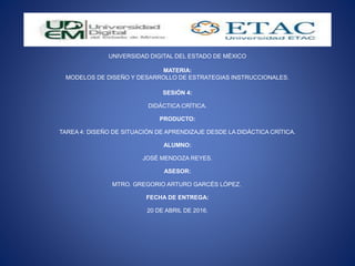 Este documento presenta el diseño de una situación de aprendizaje para alumnos de 4° de primaria desde la perspectiva de la didáctica crítica. La situación de aprendizaje consiste en un proyecto para que los alumnos escriban un relato a partir de narraciones mexicanas. Incluye actividades de inicio, desarrollo y cierre, así como materiales, evaluación y referencias bibliográficas.