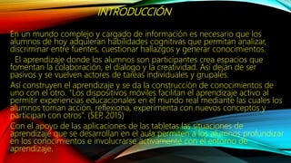 El documento explora el uso de aplicaciones y tabletas para mejorar el aprendizaje de matemáticas en estudiantes de sexto grado, enfatizando la importancia de un aprendizaje activo y colaborativo. A través de ejemplos prácticos como el uso de fracciones y reparticiones, se promueve la reflexión y la corrección de errores por parte de los alumnos. Concluye que la integración de tecnología en el aula debe ser contextualizada según las necesidades educativas de los estudiantes y la comunidad.