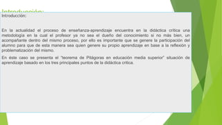 El documento describe una situación de aprendizaje basada en la didáctica crítica para enseñar el teorema de Pitágoras a estudiantes de educación media superior. La lección se divide en tres partes: apertura, desarrollo y cierre. En la apertura, los estudiantes exploran el teorema para resolver un problema sobre la longitud de una cuerda de puente. En el desarrollo, practican aplicando el teorema a ejemplos contextuales. En el cierre, realizan más ejercicios y reflexionan sobre su