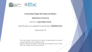 El documento presenta el diseño de una situación de aprendizaje basada en los planteamientos de la didáctica crítica para la asignatura de Modelos de diseño y desarrollo de estrategias instruccionales. El diseño incluye tres momentos: 1) una introducción sobre la importancia de la educación y los instrumentos metodológicos como la didáctica crítica, 2) un desarrollo explicando las limitaciones de la tecnología educativa y cómo la didáctica crítica superó esto al enfocarse más en el individuo