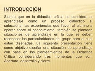 Este documento presenta un diseño didáctico crítico para promover la lectura entre estudiantes. El diseño propone dividir a los estudiantes en equipos para leer literatura y desarrollar proyectos. Incluye tres momentos: 1) una apertura donde el maestro evalúa los intereses de lectura de los estudiantes para formar equipos equilibrados, 2) un desarrollo donde los equipos dialogan sobre las lecturas y planean proyectos, y 3) un cierre donde los equipos presentan sus proyectos y se provee comentario
