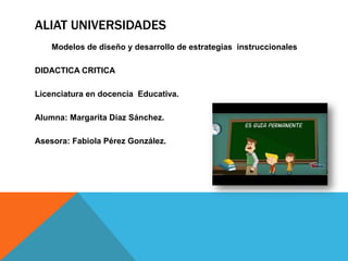 La Didáctica Crítica plantea analizar críticamente la práctica docente y la dinámica de la institución educativa. Concibe el aprendizaje como un proceso dialéctico que implica momentos de ruptura y reconstrucción del conocimiento. Busca romper la relación de dependencia entre docente-alumno-contenido, organizando actividades grupales para la reconstrucción colectiva del conocimiento. El documento presenta los supuestos y etapas de la Didáctica Crítica y describe una situación de aprendizaje para apoy