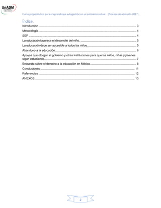 Este documento resume una investigación sobre el derecho a la educación de los niños en México. Explica que aunque la educación es importante para el desarrollo de los niños, alrededor de 4.1 millones de niños en México están en riesgo de abandono escolar. Detalla algunas de las causas comunes del abandono, como problemas económicos y la necesidad de que los niños trabajen para apoyar a sus familias. También describe algunos de los esfuerzos del gobierno mexicano y otras instituciones para apoyar a los niños