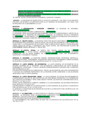 Este documento establece la constitución de una sociedad anónima entre varios socios. Detalla la denominación social, el capital social suscrito y pagado, la composición del directorio y los cargos gerenciales. Además, incluye un estatuto que regula aspectos como el objeto social, emisión de acciones, convocatoria a juntas generales y facultades de los órganos de administración.