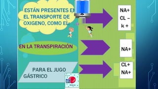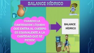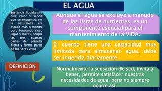 El documento define el agua como un componente esencial para la vida que constituye cerca de las dos terceras partes del peso del cuerpo humano. El agua tiene funciones importantes como transportar nutrientes y desechos a través del cuerpo, lubricar tejidos y regular la temperatura corporal. El cuerpo obtiene agua a través de la ingesta de líquidos y alimentos, así como de procesos metabólicos, y la pierde a través de la orina, heces, sudoración y respiración.