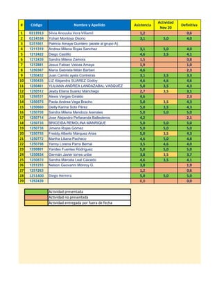 Este documento presenta los resultados de una actividad realizada por 29 estudiantes. Incluye el código, nombre y apellido de cada estudiante, así como su asistencia y calificación en la actividad. Algunos estudiantes asistieron al grupo A, otros entregaron la actividad fuera de fecha o no la presentaron. La mayoría de estudiantes recibieron calificaciones entre 3 y 5.