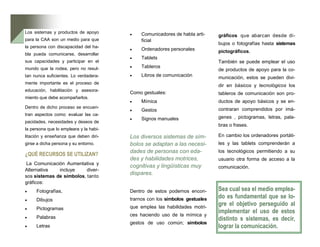 Este documento describe los sistemas de comunicación aumentativos y alternativos (SAAC) que ayudan a personas con discapacidades del habla a comunicarse. Los SAAC incluyen símbolos gestuales, gráficos y productos de apoyo como tableros, ordenadores y tabletas con imágenes, letras y palabras. El objetivo es encontrar la mejor solución para cada persona basada en sus necesidades, habilidades y entorno a través de un proceso de evaluación, enseñanza y asesoramiento continuo.