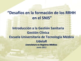 El documento describe los desafíos en la formación de los recursos humanos en salud en el Sistema Nacional Integrado de Salud, incluyendo la necesidad de cambiar paradigmas, desarrollar nuevas competencias, y adoptar enfoques multidimensionales y basados en la evidencia. También resume la historia de las organizaciones de salud y conceptos clave como gestión clínica, procesos asistenciales, indicadores de gestión, y herramientas como guías de práctica clínica.