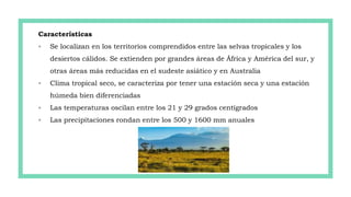 La sabana se localiza entre las selvas tropicales y los desiertos cálidos en África, América del Sur y partes de Asia y Australia. Tiene un clima tropical seco con una estación seca y húmeda bien diferenciadas, con temperaturas entre 21-29°C y precipitaciones de 500-1600 mm anuales. Está compuesta principalmente por praderas de hierbas y gramíneas, así como arbustos y árboles dispersos de menos de 10 metros. Su fauna prominente incluye grandes herbívoros como cebras, elefantes