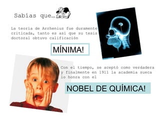 El documento resume detalles sobre la teoría de Arrhenius. Aunque su tesis doctoral recibió una calificación mínima y su teoría fue duramente criticada inicialmente, con el tiempo se aceptó como verdadera y fue honrada con el Premio Nobel de Química en 1911. Mientras que las definiciones de Arrhenius explican el comportamiento de sustancias con OH- o H+, no son suficientes para sustancias más específicas como el amoníaco. Por lo tanto, surgieron nuevas teorías posteriores para justificar el comportamiento