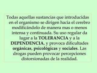 Este documento ofrece información sobre los efectos negativos del alcohol y las drogas. Explica que el alcohol es una droga depresora del cerebro que puede causar confusión, torpeza y falta de control. También detalla los riesgos para la salud del consumo excesivo de alcohol a largo plazo, como diferentes tipos de cáncer y enfermedades. El documento enfatiza que no es una buena idea consumir alcohol para divertirse y que hay muchas razones para no beber.