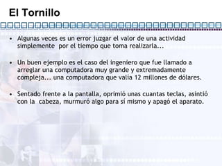 Un ingeniero arregló una computadora de 12 millones de dólares apretando un tornillo. Cuando el presidente de la compañía se quejó del precio de $1,000 por el trabajo, el ingeniero le envió una factura detallando $1 por apretar el tornillo y $999 por saber qué tornillo apretar. La lección es que el valor de un trabajo depende más del conocimiento y la experiencia que de la tarea en sí.