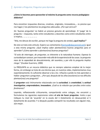 Este documento trata sobre la importancia de aprender a formular buenas preguntas para promover el aprendizaje. En primer lugar, explica que las buenas preguntas estimulan el pensamiento crítico y creativo, y permiten un diálogo profundo entre estudiantes y docentes. Luego, describe diferentes tipos de preguntas según la taxonomía de Bloom, y señala que las preguntas de reflexión son las más valiosas para el aprendizaje. Por último, ofrece ejercicios para desarrollar la habilidad de formular preguntas efectivas