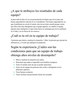 El documento describe las respuestas de un estudiante a preguntas sobre equipos de trabajo y liderazgo. El estudiante atribuye los resultados del equipo japonés a su confianza en el líder y en los remeros, mientras que critica al equipo occidental por depender demasiado del comité. Además, el estudiante explica que los roles clave en un equipo son dos analistas, un líder, un ejecutor y los demás aplicando las soluciones. Finalmente, enumera las condiciones para el alto desempeño de un equipo como