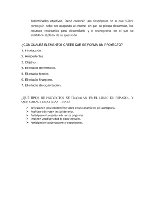 El documento describe diferentes tipos de proyectos, incluyendo proyectos de investigación, inversión, infraestructura y sociales. Explica que un proyecto es una idea para lograr un objetivo utilizando recursos y un plan de trabajo. Los proyectos ayudan a definir y organizar problemas de investigación de manera factible. Los elementos comunes de un proyecto incluyen introducción, antecedentes, objetivos, estudios de mercado, técnico, financiero y de organización.