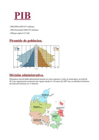 Dinamarca es un país nórdico miembro de la Unión Europea ubicado en Europa del Norte. Su capital y ciudad más grande es Copenhague. A pesar de su pequeño tamaño, Dinamarca tiene una economía fuerte basada en la exportación de maquinaria, alimentos y energía. El cristianismo luterano es la religión oficial y el fútbol es el deporte más popular.