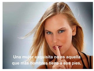 El documento describe las cualidades de una mujer exquisita. Señala que una mujer exquisita no es necesariamente la más bella o joven, sino aquella que puede alegrar la vida de otros con una sonrisa y buen consejo. También destaca que una mujer valiosa es aquella que sacrifica sus sueños para hacer felices a los demás. Finalmente, elogia a los hombres que valoran y aprecian a sus parejas como compañeras.