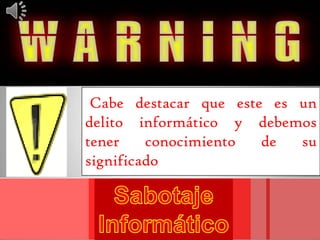 Este documento explica los conceptos de delito informático y sabotaje informático. Define el delito informático como cualquier comportamiento criminal que involucre el uso indebido de medios informáticos. Explica que el sabotaje informático consiste en borrar, suprimir o modificar sin autorización funciones o datos de una computadora con la intención de obstaculizar su funcionamiento normal, y puede incluir técnicas como virus, gusanos, acceso no autorizado a sistemas y espionaje. También describe los sujetos de un sabotaje informático como el