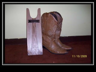 Este anuncio describe un sacabotas hecho a mano en Costa Rica de madera de laurel lustrada y encerada, con un soporte encolado y atornillado. El sacabotas es fabricado y distribuido por la empresa Bucephalos CR.