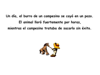 Un burro cayó en un pozo y el campesino intentó sacarlo sin éxito. Los vecinos ayudaron a tapar el pozo con tierra, pero el burro se sacudía con cada palada para subir un paso hasta que logró salir del pozo. El cuento enseña que a pesar de los problemas de la vida, uno puede superarlos sacudiéndose la tierra y dando un paso hacia adelante.