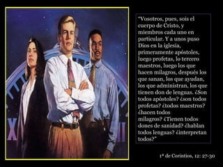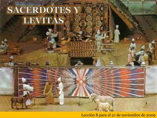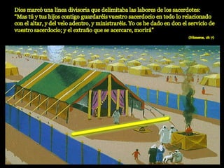 El documento describe las diferentes tareas y ministerios que Dios asignó a los sacerdotes, levitas e israelitas en el antiguo Israel. Los sacerdotes se encargaban del tabernáculo y los sacrificios, los levitas les asistían y ambos dependían de las ofrendas del pueblo. Los levitas también recibían diezmos pero no tenían territorio. El documento explica el significado simbólico de la vaca rojiza de purificación y cómo se usaban sus cenizas para purificar.