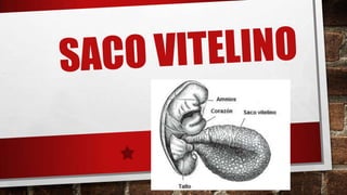 El saco vitelino es una membrana extraembrionaria que se origina en la segunda semana del embarazo y contribuye a la difusión de nutrientes, la formación de células sanguíneas y el desarrollo del intestino. El conducto onfalomesentérico comunica el saco vitelino con el intestino medio durante la cuarta semana y su falta de reabsorción puede causar el divertículo ileal de Meckel. La onfalitis es una infección del ombligo o saco vitelino causada principalmente por bacterias como E. coli