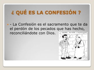 La confesión es un sacramento mediante el cual los pecados son perdonados y la persona se reconcilia con Dios. Jesús estableció la confesión el día de su resurrección cuando le dio a los apóstoles el poder de perdonar pecados en su nombre. Para confesarse correctamente, una persona debe examinar su conciencia, arrepentirse sinceramente de sus pecados, proponer enmendar su vida, confesar sus pecados al sacerdote y hacer penitencia.