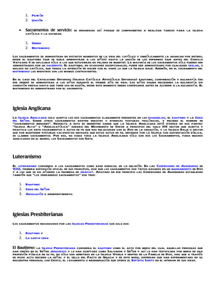El documento resume las perspectivas de diferentes religiones cristianas sobre los sacramentos. La Iglesia Católica reconoce siete sacramentos, mientras que las iglesias protestantes reconocen entre dos y cinco, dependiendo de la denominación. Algunas iglesias como los Cuáqueros y Testigos de Jehová reconocen solo uno o ninguno. Generalmente, el bautismo y la eucaristía son los sacramentos comunes a más denominaciones.