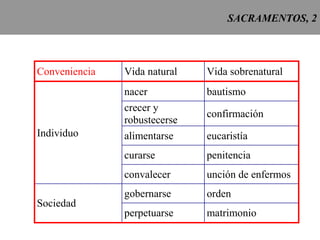 Este documento describe los sacramentos en la Iglesia católica. Explica que a través de los sacramentos, Cristo manifiesta y comunica su obra de salvación. Los sacramentos son signos eficaces de la gracia instituidos por Cristo que dispensan la vida divina. También describe los efectos de los sacramentos como la gracia santificante, la gracia sacramental y el carácter para algunos sacramentos.