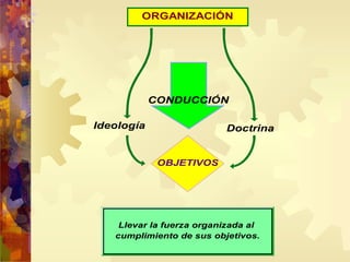 El documento describe los conceptos clave de la conducción. La conducción implica liderar una organización hacia el cumplimiento de sus objetivos de manera inspirada y creativa en lugar de ser burocrática. Un buen conductor necesita sensibilidad social, conocimiento de la realidad y comprensión de la doctrina de la organización. La capacitación, unidad y solidaridad son condiciones esenciales para la conducción efectiva.