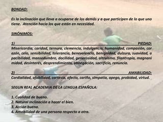 Este documento presenta definiciones y sinónimos de varios valores como la bondad, creatividad, fe, fortaleza, generosidad, gratitud, honestidad, identidad, laboriosidad, paciencia, paz, perseverancia, responsabilidad, puntualidad, respeto, solidaridad y tolerancia. Cada valor se define según el Diccionario de la Real Academia Española y se incluyen algunas frases relacionadas. El documento fue escrito por la Universidad Deportiva del Sur el 27 de mayo de 2012.