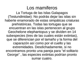 Las tortugas de las Islas Galápagos pertenecen a 14 subespecies diferentes que se distinguen por el tamaño y forma de su caparazón, cuello y extremidades. Tres de estas subespecies ya se han extinguido y existe el riesgo de que una cuarta subespecie se extinga si no se encuentra pronto una pareja para el último ejemplar macho conocido como "el solitario George". Las iguanas de tierra de las islas, igualmente endémicas, se alimentan de cactus espinosos paránd
