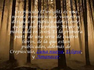 La serie Crepúsculo sigue la historia de amor entre la humana Isabella Swan y el vampiro Edward Cullen. Cuando Bella se muda a Forks y conoce a Edward, descubre su naturaleza vampírica pero se enamoran el uno del otro. Su relación enfrenta varios peligros como otros vampiros que amenazan a Bella y la tensión entre Edward y el hombre lobo Jacob Black. Eventualmente se casan y tienen una hija, pero los antiguos vampiros Vulturi los amenazan y preparan una batalla.