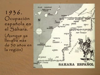 El conflicto del Sáhara Occidental comenzó en 1975 cuando España abandonó la región y Marruecos la ocupó militarmente, rechazando el derecho a la autodeterminación del pueblo saharaui. Desde entonces, el Frente Polisario lucha por la independencia mientras que Marruecos mantiene el control a través de su muro de defensa de 2,700 km y la explotación de los recursos naturales. La ONU ha fracasado en la organización de un referéndum justo y 165,000 saharauis viven como ref