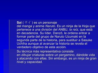 Sai es un ninja de la aldea oculta de la Hoja que pertenece a la división Raíz del ANBU. Fue asignado al equipo de Naruto para sustituir a Sasuke, aunque su verdadero objetivo era espiarlos para Danzō. A lo largo de la historia va desarrollando la capacidad de sentir emociones y establece una amistad con Naruto y los demás.