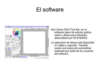 Easy Paint Tool SAI es un software de edición de imágenes raster y dibujo desarrollado por SYSTEMAX. Se lanzó en 2004 y su versión 1.0 salió en 2008. Aunque es shareware, los usuarios han creado accesorios extraoficiales. Ofrece herramientas de dibujo personalizables y compatibilidad con capas y formatos como PSD y PNG. Gracias a su simplicidad para el dibujo digital, es popular entre artistas manga e ilustradores.