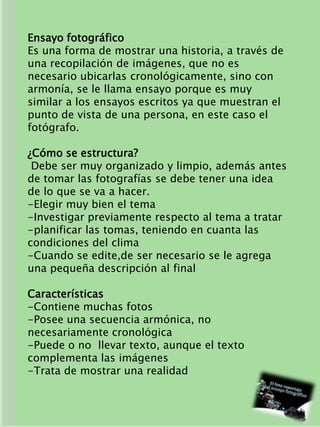 Este documento discute el ensayo fotográfico y el foto reportaje. Explica que el ensayo fotográfico usa una serie de imágenes para contar una historia sin orden cronológico, mientras que el foto reportaje cuenta un hecho noticioso actual usando las 5W. Ambos requieren planificación y estructura, aunque el ensayo puede ser de cualquier tema y época y el foto reportaje debe ser objetivo y actual. Finalmente, se discute brevemente el desarrollo histórico de la fotografía