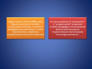 El documento discute el desarrollo de la pedagogía desde el siglo XX hasta la actualidad, incluyendo los paradigmas de la modernidad y la posmodernidad. También analiza los modelos pedagógicos conductista y constructivista, así como el papel cambiante del docente. Concluye que la posmodernidad ofrece una crítica valiosa de la modernidad al tiempo que genera nuevos conocimientos y retoma los elementos válidos de la modernidad.