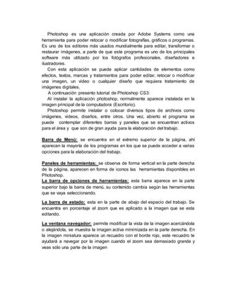 El documento describe las principales características y herramientas de Photoshop. Explica que Photoshop es un programa de edición de imágenes creado por Adobe que permite retocar fotografías y gráficos. Luego detalla las barras, paneles y ventanas clave del programa como la barra de menú, las herramientas, la barra de estado y las ventanas de navegador, información, color e historia. Finalmente, explica algunos formatos de archivo compatibles con Photoshop como PSD, PSB y PDD.