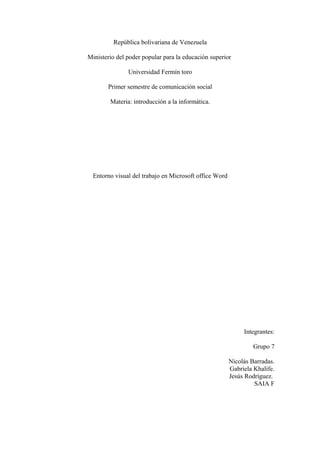 Este documento describe los elementos básicos de la interfaz de usuario de Microsoft Word. Explica que la barra de herramientas de acceso rápido contiene opciones comunes como guardar, deshacer y rehacer. Las cintas de opciones organizadas en pestañas contienen las herramientas necesarias para realizar acciones en Word. La barra de estado muestra información sobre el documento como el número de páginas.
