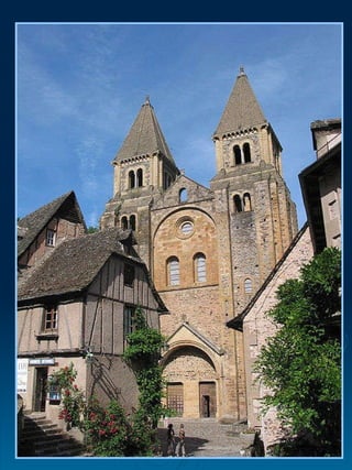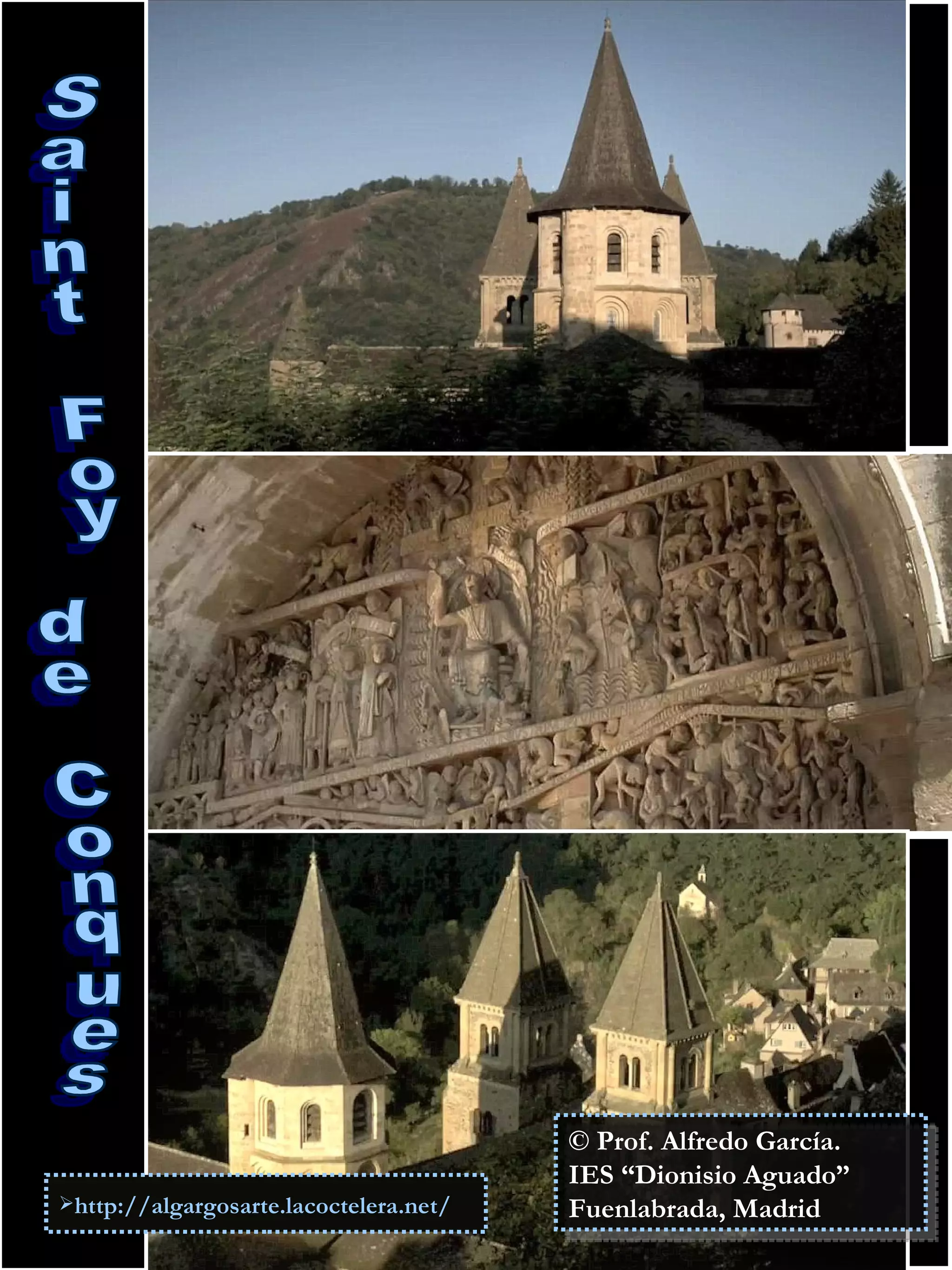 El documento describe escenas del Juicio Final según está representado en la iglesia de Saint Foy de Conques. Cristo preside el juicio desde un trono celestial y dicta sentencias, enviando a los justos al cielo y a los pecadores al infierno. En el cielo reina la paz entre santos y mártires, mientras que en el infierno los condenados sufren tormentos eternos diseñados según sus pecados.