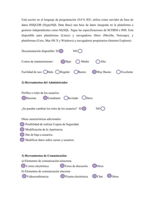 Sakai es una plataforma educativa de código abierto con más de 34 idiomas disponibles. Ofrece numerosas herramientas para docentes y estudiantes como foros de discusión, chats, evaluaciones y portafolios. Aunque es compleja y requiere Java, proporciona gran escalabilidad, interoperabilidad y posibilidades de extensión. Los usuarios destacan su gestión, audioconferencia y repositorio compartido, pero señalan problemas de usabilidad y documentación desorganizada.